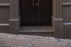 Revestimiento de Fachada a medida en marmol gris sierra elvira, con moldura central y molduras en puertas. Se ha realizado un recubrimiento para esconder los cables de suministro electrico y otros que antes pasaban a la vista por la fachada.
